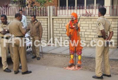 Photo Caption : Mischievous Swamiji standing outside Yeddyurappa Son Vijayendra Residence to meet their family members at Shivananda Circle, in Bangalore on Wednesday 27th February 2013