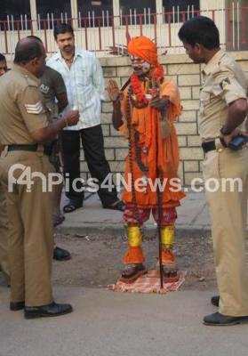 Event Description : Mischievous Swamiji standing outside Yeddyurappa Son Vijayendra Residence to meet their family members at Shivananda Circle, in Bangalore on Wednesday 27th February 2013
