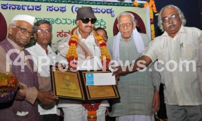 Photo Caption : Vatal Nagaraj, President, Kannada Chalavali Vatal paksha being felicitated by Dr Ho Srinivasaiah, President,. Karnataka Gandhi Smaraka Nidhi with HS Doreswamy, Freedom Fighter and others at Kannada Sahitya Parishath, in Bangalore on Friday 1st March 2013