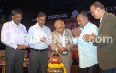 Photo Caption : Dr Thimappa Gowda, Vice Chancellor, Bangalore University seen lighting lamp to inaugurate the Bangalore University Yuvajanotsava programme at Jnana Jyothi Audtorium, also seen Vishu Kumar, Director, Information Department, Hamsa Lekha, Music Director, in Bangalore on Tuesday 5th March 2013