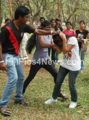 Photo Caption : Students of Sankara College of Optomestry, staged a street play on Womens Harassment, on the occasion of International Womens Day Celebration at Cubbon Park, in Bangalore on Friday 8th March 2013