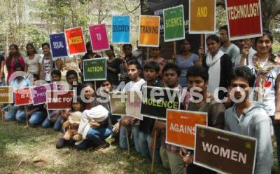 Photo Caption : Students of Sankara College of Optometry protest against Women Harassment, on the occasion of International Womens Day Celebration at Cubbon Park, in Bangalore on Friday 8th March 2013