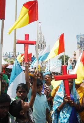 Photo Caption : Members of Karnataka Dalith Christians Protection Forum participate in a protest rally condemning the attacks on Dalith Catholic Priests, at Russel Market, in Bangalore on Sunday 10th March 2013