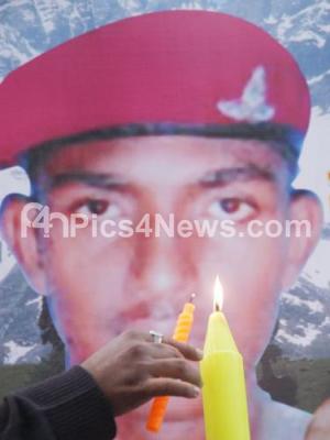 Photo Caption : Members of Congress Committee lit candles in condolence to Satish, 27 Years Soldier from Alambaadi Village in KR Pet, who was killed during the suicide attack by terrorists, who stormed the CRPF camp in Srinagar, the candle light programme was held at Gandhi Statue, Anand Rao Circle, in Bangalore on Thursday 14th March 2013