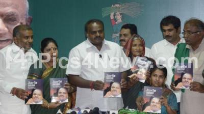 Photo Caption : HD Kumarswamy, JDs President with GT Devegowda, JDs Leader and others seen releasing the book Nirdharita Nayaka at JDs Media Centre, in Bangalore on Saturday 16th March 2013