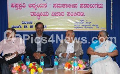 Photo Caption : Dr Mallepuram G Venkatesh with Dr S Vidyashankar, Kamala Hampana and others seen during the National Seminar on Kannada Research Centre at premises, in Bangalore on Monday 18th March 2013