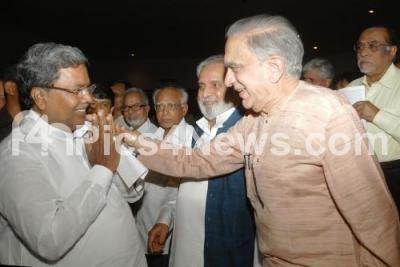 Photo Caption : Siddharamaiah, Opposition Leader greeting UR Ananthmurthy, Jnanpith Awardee and Prof Govind Rao, during the Seminar on Present Status of Deprived Section at Jnanajyothi Auditorium, in Bangalore on Wednesday 20th March 2013