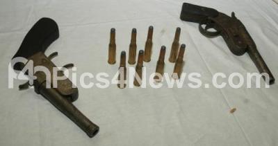 Photo Caption : 2 Country made Pistols and 8 Bullets, which were recovered from Neeraj Sharma by Madiwala Police Station, displayed during the press meet at Police Commissioner Office, in Bangalore on Wednesday 20th March 2013