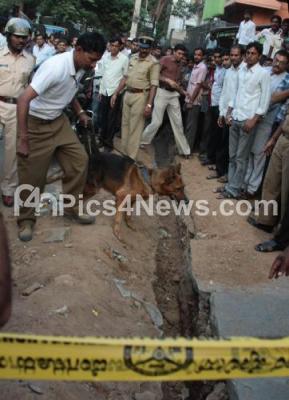 Photo Caption : Sniffer Dogs seen at the spot where Sharan Kumar, Owner, Rishabh Jewellers was murdered by some miscreants at Rajajinagar, 3rd Block, in Bangalore on Saturday 23rd March 2013
