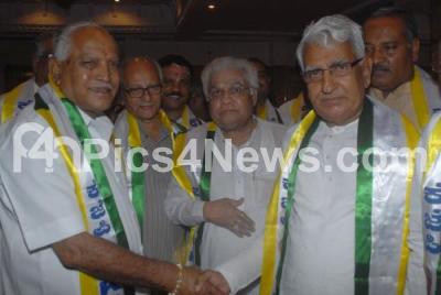 Photo Caption : BS Yeddyurappa, KJP State President greeting KJP Leaders CM Udasi and others, during the Workshop for new entrants of KJP and first batch candidates for ensuing state assembly Elections at Hotel Capitol, in Bangalore on Monday 25th March 2013