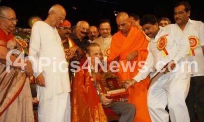 Photo Caption : Shivamogga Subbanna being felicitated by Nirmalanandanatha Swamiji with DB Chandrashekhar, MP, Javare Gowda and others, during the Kuvempu Utsav and Award Presentation Programme at Ravindra Kalakshetra, in Bangalore on Friday 29th March 2013