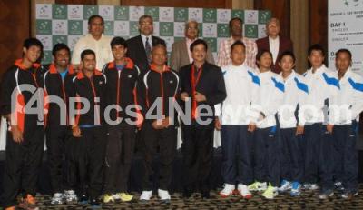 Photo Caption : Shatrugan Sinha, Actor seen with Indian and Indonesian Tennis Players, during the press meet on Davis Cup at Hotel Atria, in Bangalore on Thursday 4th April 2013
