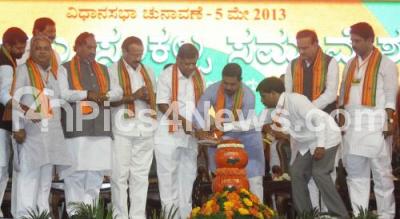 Photo Caption : DV Sadananda Gowda, Vice President, National BJP with Prahlad Joshi, BJP State President, Jagadish Shettar, Chief Minister, Deputy Chief Ministers KS Eeshwarappa and R Ashok, and MP Ananth Kumar seen lighting lamp to inaugurate the BJP Vijaya Sankalpa Samavesha at Palace Grounds, in Bangalore on Monday 8th April 2013