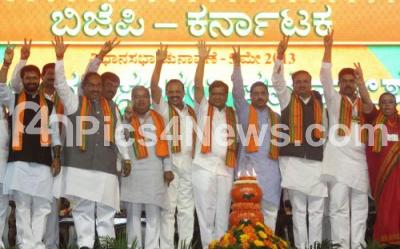 Photo Caption : BJP Leaders DV Sadananda Gowda, Vice President, National BJP with Prahlad Joshi, BJP State President, Jagadish Shettar, Chief Minister, Deputy Chief Ministers KS Eeshwarappa and R Ashok, Ananth Kumar, MP with Ministers Murugesh R Nirani, Bache Gowda, CT Ravi, Govind karjol and others symbolize Victory sign, during the BJP Vijaya Sankalpa Samavesha at Palace Grounds, in Bangalore on Monday 8th April 2013