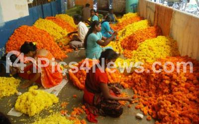 Photo Caption : Vendors preparing flowers ahead of Ugadi at KR Market, in Bangalore on Wednesday 10th April 2013