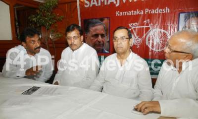 Photo Caption : Samajwadi Leaders Karunakara, R Rai, K Nanda, K Faruqui seen discussing during the press meet at Ashraya International Hotel, in Bangalore on Saturday 13th April 2013