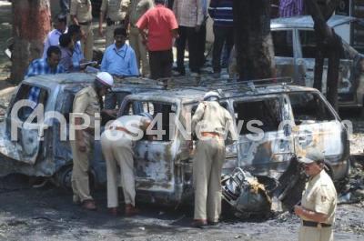 Photo Caption : Tight Police Security inspecting A blast suspected to have been triggered with high intensity explosives charred 6 vehicles and KSRP Van, injured 16 People including 8 Cops and Extensive damage to many houses near BJP Office, Malleshwaram, in Bangalore on Wednesday 17th April 2013