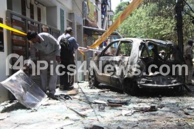 Photo Caption : Forensic Department Officials investigating the blast suspected to have been triggered with high intensity explosives charred 6 vehicles and KSRP Van, injured 16 People including 8 Cops and Extensive damage to many houses near BJP Office, Malleshwaram in Bangalore on Wednesday 17th April 2013