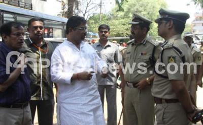 Photo Caption : R Ashok, Deputy Chief Minister discussing with Raghavendra Auradkar, Police Commissioner and Higher Police Officials, after the blast suspected to have been triggered with high intensity explosives charred 6 vehicles and KSRP Van, injured 16 People including 8 Cops and Extensive damage to many houses near BJP Office, Malleshwaram, in Bangalore on Wednesday 17th April 2013