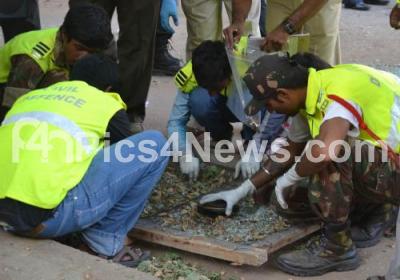 Photo Caption : Civil Defence Officials inspecting sharpnels after blast suspected to have been triggered with high intensity explosives charred 6 vehicles and KSRP Van, injured 16 People including 8 Cops and Extensive damage to many houses near BJP Office, Malleshwaram, in Bangalore on Wednesday 17th April 2013