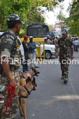 Photo Caption : Tight Security inspecting A blast suspected to have been triggered with high intensity explosives charred 6 vehicles and KSRP Van, injured 16 People including 8 Cops and Extensive damage to many houses near BJP Office, Malleshwaram, in Bangalore on Wednesday 17th April 2013