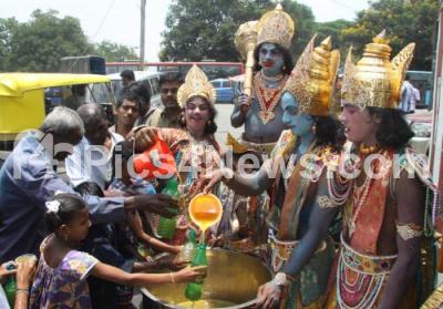 Event Description : Artists dressed like Sri Rama and Hanuman share Panaka and Majjige, on the eve of Sri Ramanavami Festival near Anand Rao Circle, in Bangalore on 19th of April 2013