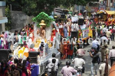 Photo Caption : Devotees partake in Shubh Yatra, on the Eve of Mahaveer Jayanti Celebrations from Freedom Park to Town Hall, in Bangalore on Tuesday 23rd April 2013