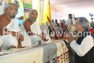 Photo Caption : Lehar Singh, MLC greeting Saints, during the Mahaveer Jayanthi Celebrations at Freedom Park, in Bangalore on Tuesday 23rd April 2013
