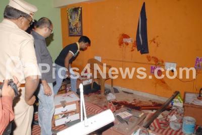 Photo Caption : Police Officials inspecting the spot, where an attempt to Murder took place at Malleshwaram, in Bangalore on Tuesday 23rd April 2013
