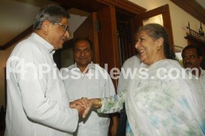 Photo Caption : Ambika Soni, Senior Congress Leader greeting SM Krishna, during her arrival for the meeting, also seen AK Antony, Defence Minister of India at SM Krishna Residence, in Bangalore on Wednesday 24th April 2013