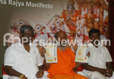 Photo Caption : Shri Venkataramana Swamy with independent candidates Harish from Hebbal Constituency and R Nagaraja from Chickpet Constituency seen releasing Rama Rajya Manifesto, during the press conference, in Bangalore on Wednesday 1st May 2013