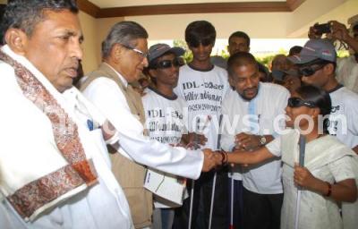 Event Description : SM Krishna, Congress Senior Leader being greeted by members of IDL Foundation Blind Band Team, on the eve of his 82nd Birthday at his residence, Sadashivanagar, in Bangalore on Wednesday 1st May 2013