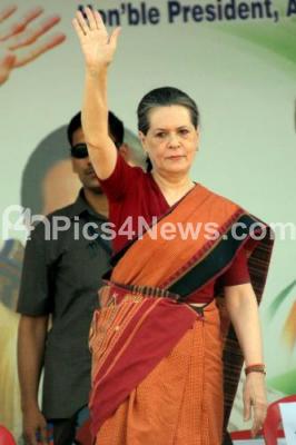 Photo Caption : Sonia Gandhi, AICC President waves for her supporters, during the Public Meeting ahead for Karnataka Assembly Elections at Palace Grounds, in Bangalore on Thursday 2nd May 2013
