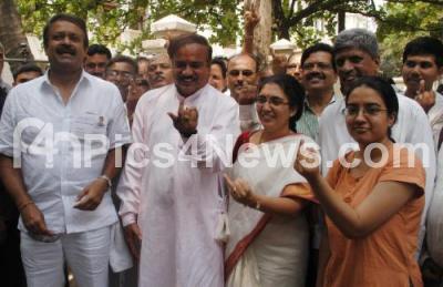 Photo Caption : Ananth Kumar, MP with wife flashed their marking after casting their vote for Karnataka Assembly Elections at RV Teachers College, in Bangalore on Sunday 5th May 2013