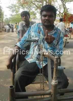 Photo Caption : Physically challenged Voter flashed his marked finger after casting his vote for Karnataka State Elections at a polling station in Doddaballapura on Sunday 5th May 2013