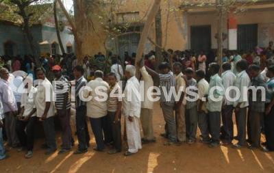 Photo Caption : Voters standing in a queue to cast their vote for Karnataka State Elections at a polling station in Doddaballapura on Sunday 5th May 2013