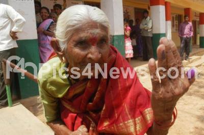 Photo Caption : Old woman flashed her marked finger after casting her vote for Karnataka State Elections at a polling station in Hoskote on Sunday 5th May 2013