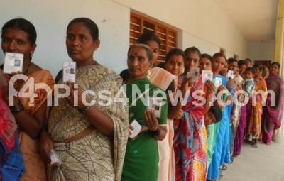 Photo Caption : Voters flash their Identification Cards, waiting in a queue to cast their vote for Karnataka State Elections at a polling station in Hoskote on Sunday 5th May 2013