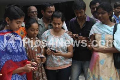 Photo Caption : Students watching their results in Mobile phones at SSLC Board, in Bangalore on Monday 6th May 2013