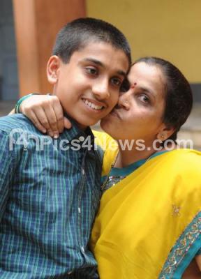 Photo Caption : Proud Mother kisses her Son Sudheendra, SSLC Topper from Vijaya College at College premises, in Bangalore on Monday 6th May 2013
