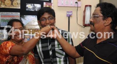 Photo Caption : Parents feed sweet to Vignesh, SSLC Topper scoring 618 Marks from CFTRI School, in Mysore on Monday 6th May 2013