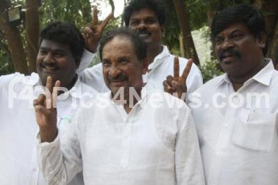 Photo Caption : Congress Candidate KJ George symbolises Victory after winning for Sarvagna Nagar constituency in Karnataka Assembly Elections, in Bangalore on Wednesday 8th May 2013