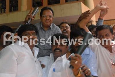Event Description : BJP Candidate M Krishnappa celebrates after winning for Bangalore South in Karnataka Assembly Elections, in Bangalore on Wednesday 8th May 2013