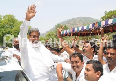 Photo Caption : Congress Candidate Siddharmaiah greets supporters after winning for Varuna Constituency in Karnataka Assembly Elections, in Mysore on Wednesday 8th May 2013