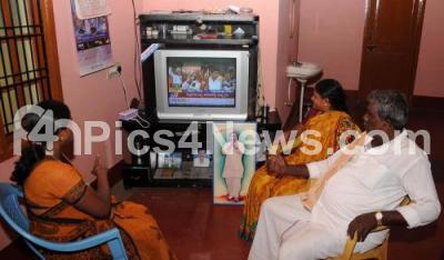 Photo Caption : Siddaramaiah Family Members watching news as who will win for the next Chief Ministers Designation at their residence, in Mysore on Saturday 11th May 2013
