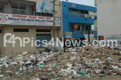 Photo Caption : Bad State of Affairs seen outside Indian Children English School as Garbage is dumped in front of School, at Kumariamman Nagar, Kadugondanahalli, in Bangalore on Friday 17th May 2013