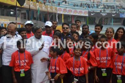 Photo Caption : Siddaramaiah, Karnataka Chief Minister interacting with Children, during the TCS World 10K Bangalore 2013 at Kanteerva Stadium, in Bangalore on Sunday 19th May 2013