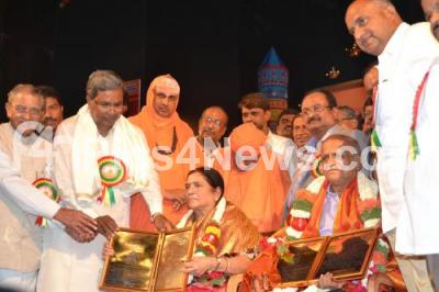 Photo Caption : Nadoja Dr MM Kalburgi being felicitated by Basavasri Award and Dr Jaya Rajashekar by Vachana Sahitya Award from Siddaramaiah, Karnataka Chief Minister with MV Rajashekharan, MLC, Shri Dr Shivakumar Mahaswamy, Shri Shivarathri Deshikendra Mahaswamy and others, during the Basava Jayanti Programme, organized by Basava Vedike at Ravindra Kalakshetra, in Bangalore on Sunday 19th May 2013