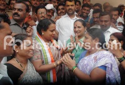 Photo Caption : Umashree, Minister for Women and child development and Kannada and Culture is seen interacting with congress workers during her visit to KPCC, in Bangalore on Monday 20th May 2013