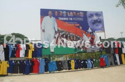 Photo Caption : Clothes hanged for Sale, below the Political Banner installed at Ulsoor Lake, in Bangalore on Tuesday 22nd May 2013